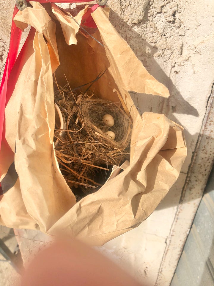 Outside the garage door, Tom had hung a brown paper bag (as you do, no idea what was in it originally!). Anyway, one month later, we found this little birds nest in the random paper bag. It has eggs in it, but they are cracked so we assume it’s been abandoned, but we are leaving it there just in case anyone decides to come back home.